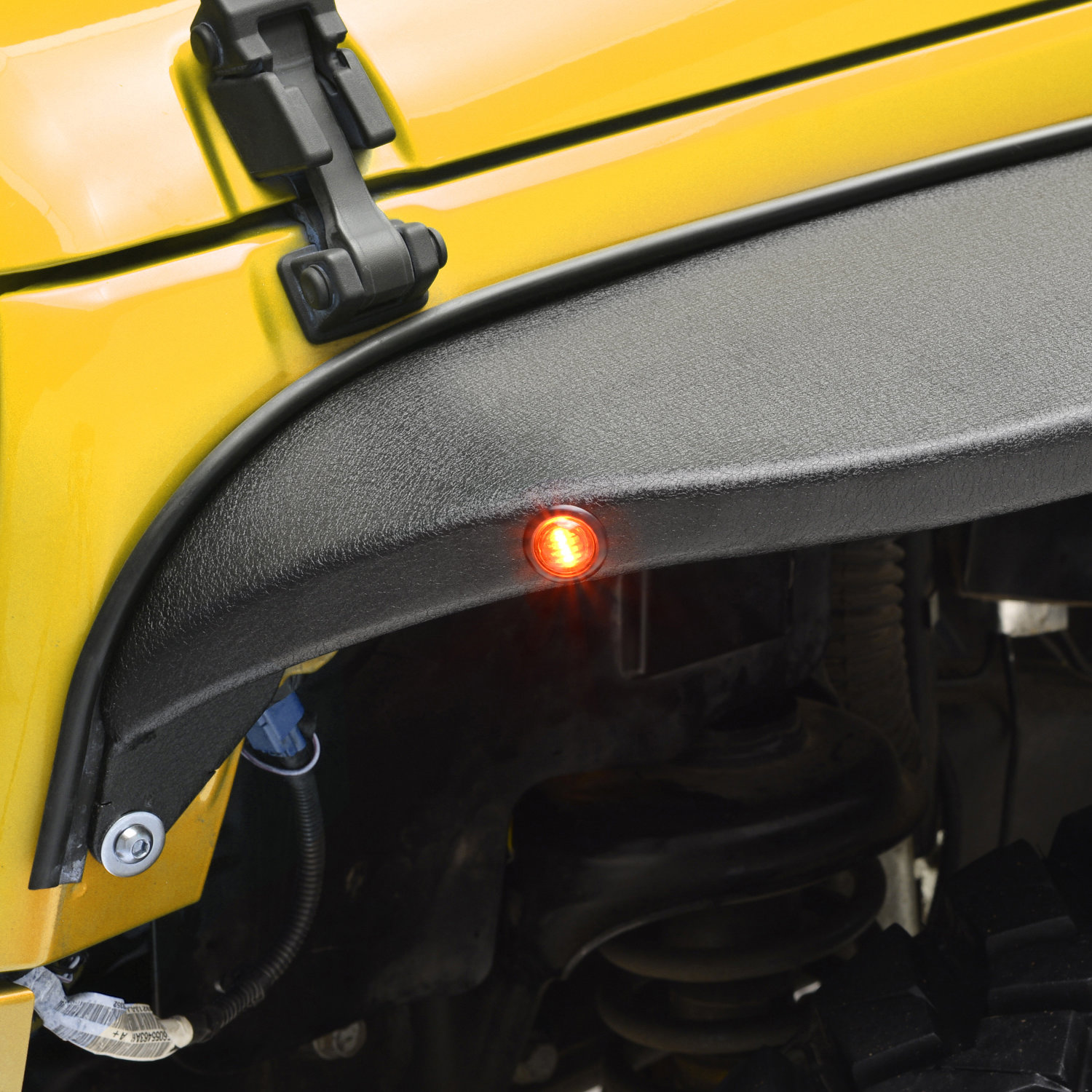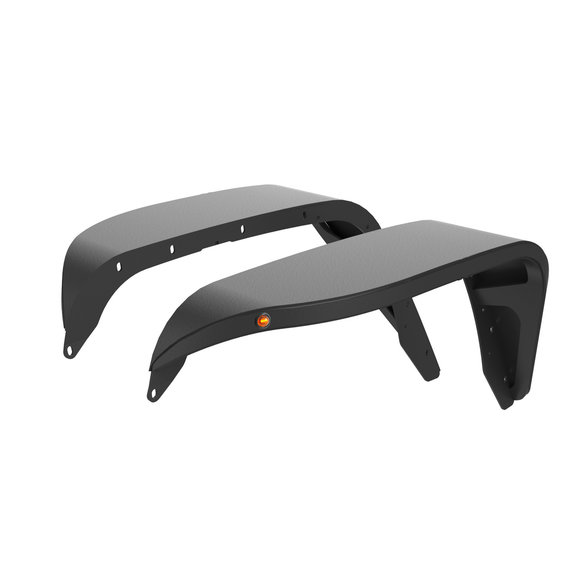 Paramount Automotive R-5 Canyon Off-Road Front Fender Flares with LED Side Markers for Jeep Wrangler JK models come in a set for the front of your Jeep. These fender flares are fabricated from 5mm cold rolled steel plate for ultimate protection. 5-axis robotic welding ensures a quality assembly process. These front fender flares offer increased tire coverage with a measurement of 8.5" of width. All hardware is included and some drilling will be required to make sturdy and secure for off road excursions. The front fender flares come with a textured black powder-coat finish for durability and corrosion resistance. The front fender flares include LED side marker lights.