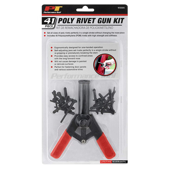 Easy Operation: The 41pc Rivet Tool Set is ergonomically designed to comfortably and easily set Poly rivets into many different applications on the vehicle with one hand.