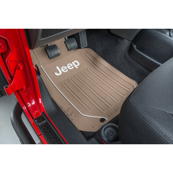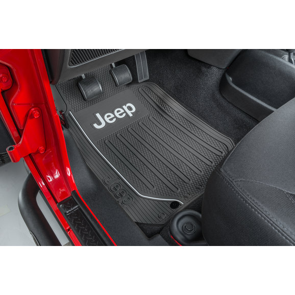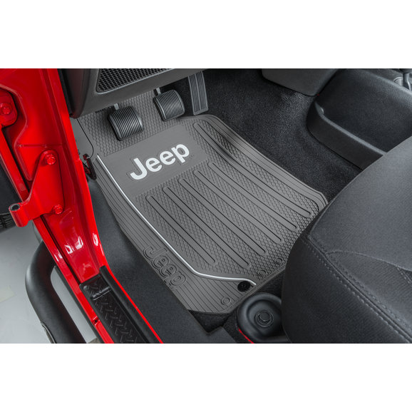 Protect the carpets in your Jeep with these universal fit floor liners from Pasticolor. The Elite Front Floor Mats were designed to fit any Jeep with only minor modification. There are molded portions of the mat that can be cut out to accommodate carpet retention hooks or different floor board configurations. They feature Officially Licensed Jeep® logos that are molded into the PVC vinyl for a long lasting fade-free mat.