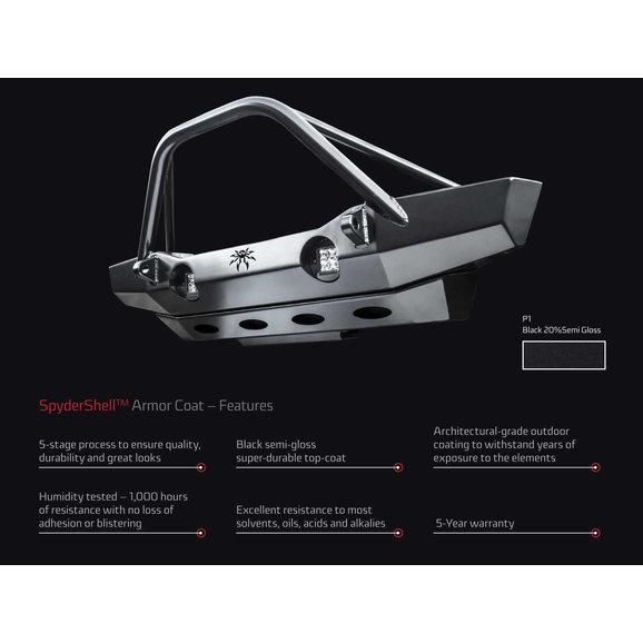Poison Spyder's SpyderShell Armor Coat has been engineered to provide your Poison Spyder product with years of unmatched great looks, corrosion protection and weather-resistance. Their proprietary 5-stage system starts with media blasting the entire part, to remove contaminants and prep the metal surface for the best possible adhesion. Next, any seams are sealed with 3M Scotch-Weld to block moisture from entering and causing corrosion where the powder can not reach. The first coat to be applied is a zinc-rich powdered black primer, which is baked on to form an impenetrable bond between the metal product and the coating. The primer is black--rather than traditional gray--so that any rock chips or trail damage are less conspicuous. The final top coat is an industrial grade, "super-durable" architectural finish in semi-gloss black, which is engineered to retain its appearance through years of exposure to sun and weather. SpyderShell is a coating process unmatched by any other Jeep armor after-market manufacturer, for which Poison Spyder are confident in offering a 5-year warranty on materials and workmanship.