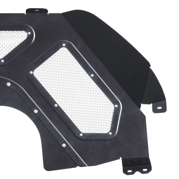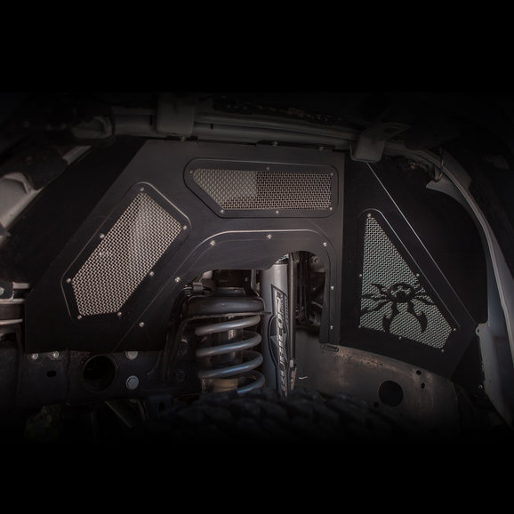 The Versatile Poison Spyder Front Inner Fender Liners for Jeep Wrangler JL & Gladiator JT are not only designed for stock suspensions but also can be fitted to provide a wide range of fitment options, including front coil over suspension. A single kit includes both vented and solid inserts for the front and rear removable panels. Vented stainless mesh inserts allow air to circulate through the engine bay. Solid aluminum inserts are Spydershell armor coated and will protect the Engine bay from debris.