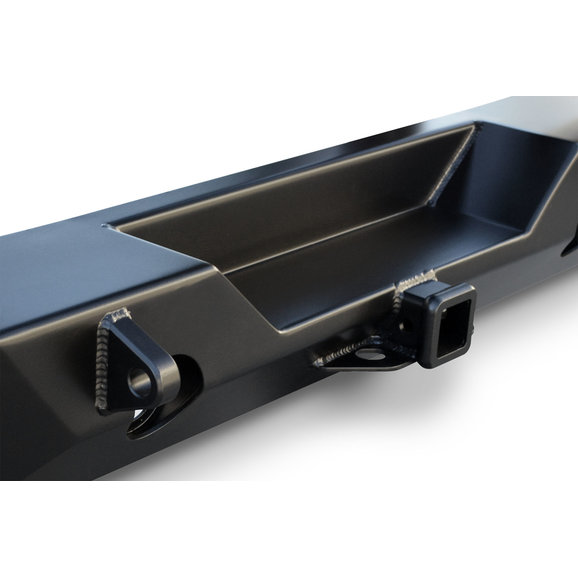INTEGRATED HITCH RECEIVER: The integrated hitch receiver accepts standard 2" hitches and recovery accessories. It is built in to the structure of the RockBrawler II Rear Bumper in order to provide a higher clearance, tougher hitch that's there when you need it, but tucked up higher out of the way for better clearance and departure angles on the trail. Includes integrated safety chain loops. IMPORTANT: The integrated hitch receiver is not rated for towing. It is intended as a recovery attachment point only.