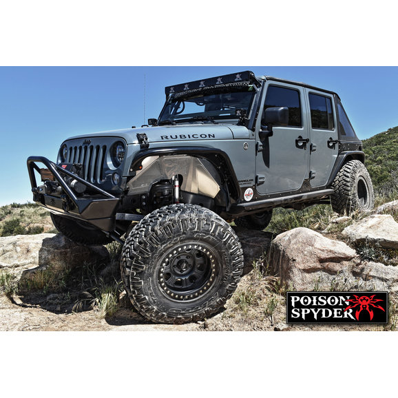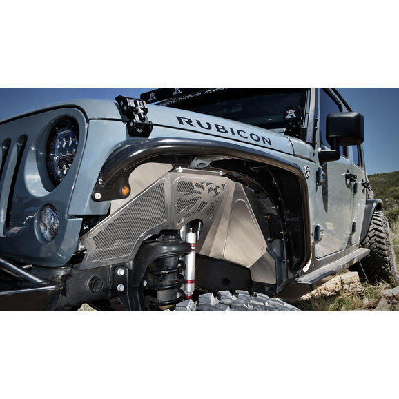 When installing a pair of Poison Spyder Crusher Flares on your JK, you have the choice of either trimming and reinstalling the stock plastic inner fendersor going with something much better looking and commensurate with the quality Crusher Flares you just installed. Poison Spyder JK Inner Fenders dress up the look of your front wheel wells with beautiful CNC laser cut, bead-rolled and brake-formed aluminum. The perfect complement to Poison Spyder Crusher Flares, other aftermarket JK flares or even the stock flares!