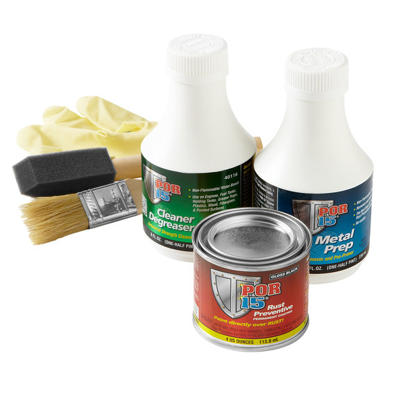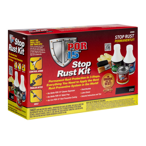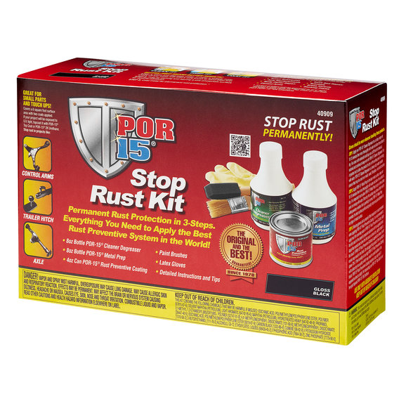 This all in one Stop Rust Kit from POR-15 is the kit you need to completely stop rust in its tracks! This 3-step process is ideal for small projects such as control arms, trailer hitches, axles, small frame/subframe sections, brake shields, and so much more. Covers 6-sq. ft. Kit includes POR-15 Cleaner Degreaser for easy dirt, wax, oil, grease removal; POR-15 Metal Prep to help neutralize rust, etch the metal, and cover it with a zinc phosphate surface; POR-15 Rust Preventive Coating which provides a super strong & durable non-pourus finish that is resistant to most alkalis, acids, oils, fuels and protects the metal for years to come!