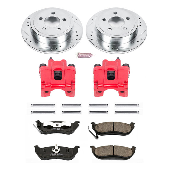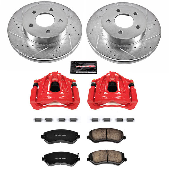 Power Stop Front & Rear Z36 Extreme Truck and Tow Brake Kit with Calipers are for those that tow/haul, as well as the off-road enthusiast. The low-dust ceramic formula brake pads are reinforced with carbon fibers to strengthen the compound. They are dust free, noise-free, and give you increased braking power on your 03-07 Jeep Liberty without sacrificing everyday drivability. The rotors are cast using the finest G3000 metallurgy with strict OE tolerances - making them a perfect, bolt-on upgrade without the need to make any modifications. Precision drill holes allow for maximum rotor cooling. This keeps your brakes temperatures down during extreme operating conditions. Rounded slots help wipe away any gas or debris - keeping a clear contact patch on the rotor surface for safe, smooth braking. Silver Zinc Dichromate plating is applied to all drilled & slotted rotors, they not only look great behind your wheels, but to help prevent rust & corrosion. Any time you add weight to a vehicle by hauling a load, towing a trailer, or simply adding a larger wheel/tire combination, you change the operating conditions of your stock brake package. Those operating conditions may exceed the ability of the stock braking components. But don’t worry, Power Stop Z36 brake kit with Calipers provide the extra stopping power to bring your Jeep to a halt quickly!