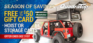 The QuadraTop 4-Point Hardtop Hoist System saves your back and gets that Jeep hardtop or other outdoor gear up and out of the way. The simple, one-person operation allows you to install or remove a hardtop in a matter of minutes without needing additional help. This complete kit comes with everything you need for easy installation. The self-locking safety cam grips the rope instantly if accidentally released. There is peace of mind knowing your valuable hardtop is protected. This multi-faceted hardtop hoist can be used to store canoes or kayaks when not used for your hardtop. When properly installed in the studs of your garage, you can safely lift up to 200 pounds. Kit includes hoist system and all necessary hardware. Features a three-year limited warranty.