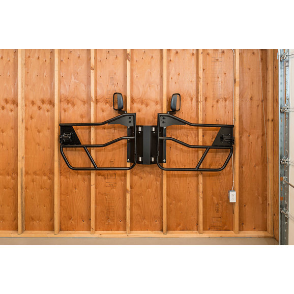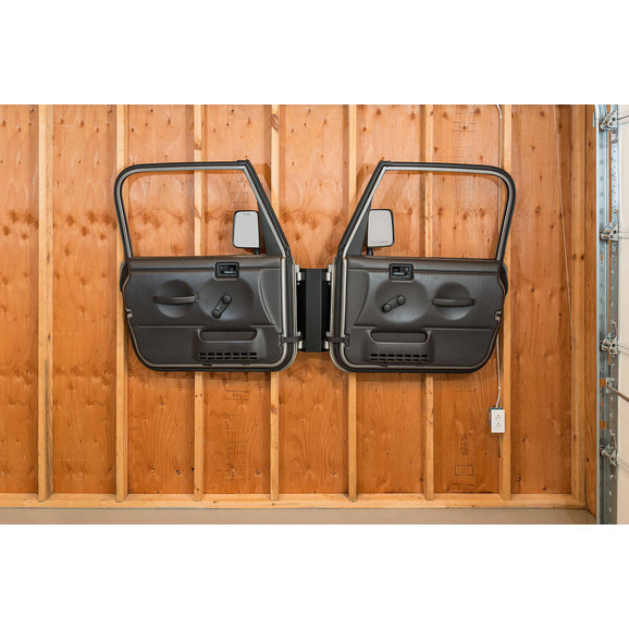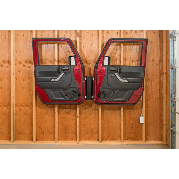 Safely hang your Wrangler doors properly by their hinges for the best in door storage devices. Our method eliminates potential damage to the weather seals and paint finish as the weight is supported by the hinges. The painted sides face the wall and off the floor and away from potential harm. Made from 16 gauge steel with a durable powder coat finish. Lag bolts are provided to securely mount to wall studs that are 16 on center. Works on full steel doors, soft doors and even tube doors making our Door Storage Hanger the perfect year round door storage solution! Holds one pair of doors. Made in USA