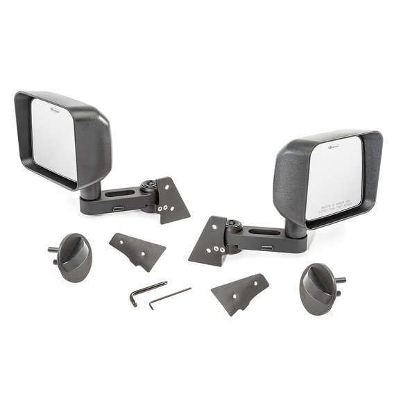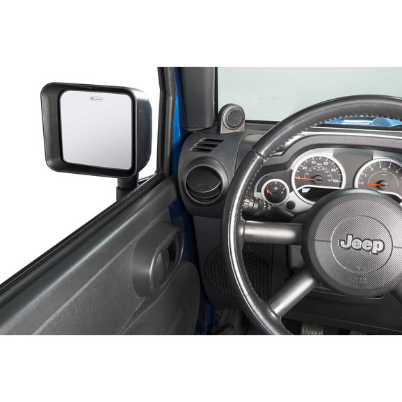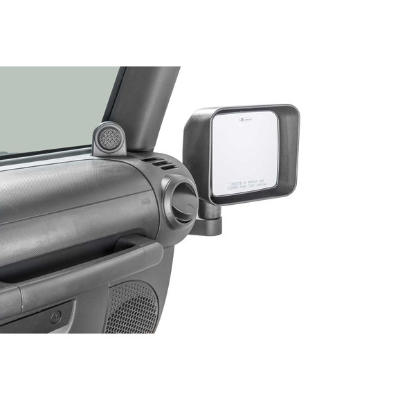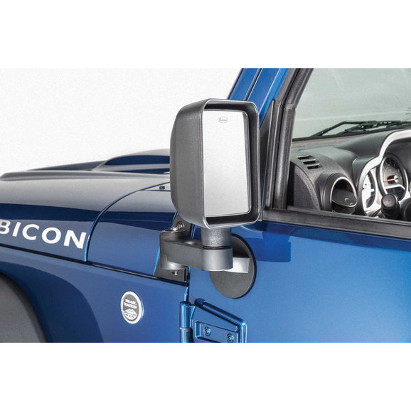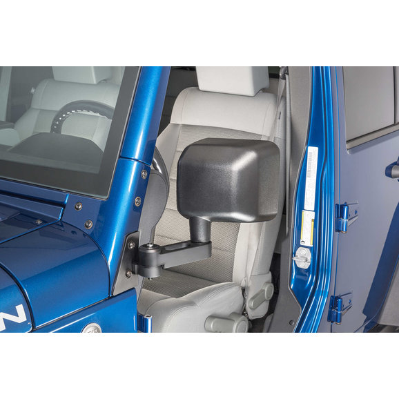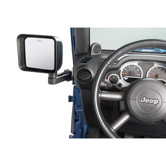 exact mirror head position as the factory door mounted versions. Simple but ingenious! When it’s time to remove the front doors, simply swing the mirror arms forward and out of the way and insert the locking pin (included) while lifting the front doors off. Uses existing bolt holes and fasteners and installation is quick and easy with no drilling or modifications required. Our exclusive kits are