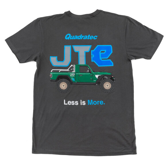 Quadratec's JTe is renowned for its performance, power and ability to help clean up trails and national parks across the country. Now, you can wear a symbol of this prestigious vehicle with pride as the JTe t-shirt blends top-quality materials with the slogan 'Less is More'. Not only does this mantra fit the only two-door hybrid Gladiator in existence, but it also means less trash on the trail means more fun for everyone. This shirt is available in all the popular sizes and is sure to find its way into your regular shirt-wearing rotation.