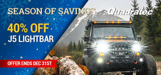 More than a powerful 18,000 lumens off road light bar! The all-new 270 watt Quadratec patented J5 LED Light Bar features five integrated amber clearance cab lights that are illuminated by your parking light switch. The fact is that overhead, forward lighting should not be turned on while driving on public roads. Not anymore, the built in marker lights on our J5’s LED Light Bar feature amber halo rings to mark the vehicle’s width and the presence of a wide and tall vehicle. The dual purpose feature provides twice the utility and double the “cool factor”. The J5 Light Bar is powered by 27 Cree LEDs comprised of fifteen 10° spot beam and twelve 30° flood beam lamps. Light bar side mount brackets allow for horizontal adjustments from 50.75” - 53.5” wide. The durable, powder-coated die cast aluminum housing is built to endure aggressive off-road use and features stainless steel hardware. Assemblies have an IP67 waterproof rating and industry standard Deutsch-style connectors with weather tight seals for years of trouble free service. Kit includes our Deluxe Plug-N-Play wiring harness and 2 bolt style “A” Pillar mounts which allow for use with mirror movers & A-pillar brackets.