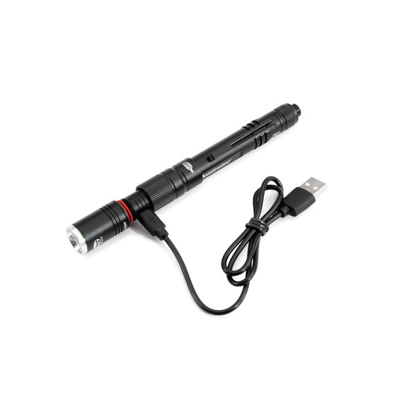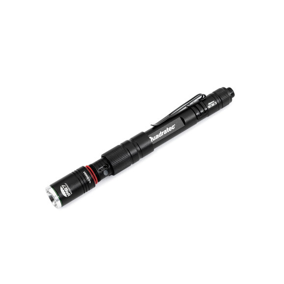 The Quadratec Rechargeable LED Pen Light is a compact yet powerful everyday carry light that will be there when you need it. Store it in your glove box, gear bag, toolbox, or use the attached clip to put it on a belt or sun visor for easy access. The included USB cable makes charging the Lithium-Ion battery easy between uses so you never run out of power. The bright 300 Lumen light features bright, dim, or strobe modes for use in any situation. The machined aluminum body displays the Quadratec logo and has an IP67 waterproof rating making the Pen Light versatile in any climate. The variable focus lens easily adjusts to illuminate a broad area near you or directly focus on anything in the distance.