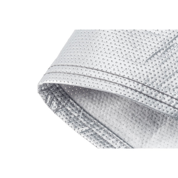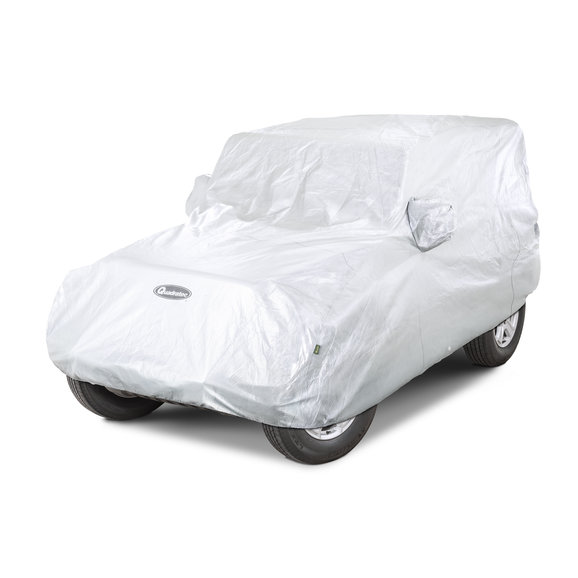 Our best 5 Layer Softbond Silver Covers for 2-Door Jeep Wrangler JL feature a reflective UV resistant outer coating with combined strength, breathability and hi-tech water proof protection at an exceptional value. Engineered to keep out liquid moisture and UV rays without trapping condensation while providing protection to paint finishes, soft tops and upholstery. Quadratec’s Softbond UV Silver Covers combine the durability of our current 5-layer covers with a high-tech UV resistant silver outer layer that helps keep vehicles cooler and drier. The middle water resistant film layer and a supplemental outer polypropylene layer provide extra water proofing. The ultra-soft inner fleece layer is gentle on paint finishes and the plastic grommets and nylon cinch cords give added security for longer term coverage in windy conditions. Front and rear hems have elastic material for a snug fit. The custom tailored patterns and over-sized mirror pockets provide an excellent fit that’s easy to install and remove. Protect your parked vehicle from mother nature, with the added protection from door dings, scratches and nicks. The embossed quick drying, breathable fabric wicks moisture away from the vehicle while allowing air to circulate from both sides. Softbond UV Silver Covers include a drawstring storage bag and a 90” vinyl coated steel cable with anti-theft brass padlock. The included grommet kit provides a do-it-yourself radio antenna provision. Three year limited warranty.