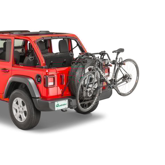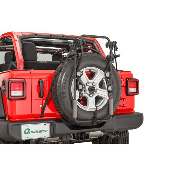 Quadratec’s Spare Tire Mount 2 Bike Rack is possibly the most versatile rack in its class. Optimized for the Wrangler, our fully adjustable rack will work with all factory tire sizes and oversized spares up to 37” x 12.50! The Bike Rack swings with the tailgate for easy access to the cargo area without rack removal. The Bike carrier arms fold down easily when not transporting bikes. Thick welded steel construction and black powder coat finish provide rugged durability. The rack holds 1 or 2 bikes with a combined weight of 70 lbs. Soft rubberized cradles and adjustable hold-down straps firmly secure bikes without marring their finish. The 22” long dual arm supports provide extra stability and is tipped with red safety reflectors. The Bike Rack Collapses to eight inches tall for storage and there’s no hitch required. This unit comes complete with nylon cinch straps and installation instructions. Quadratec includes a Three-year limited warranty with this Bike Rack.