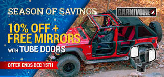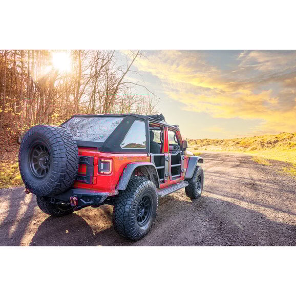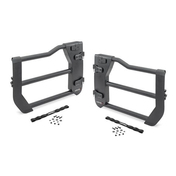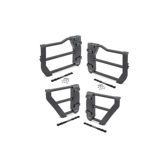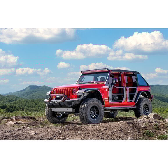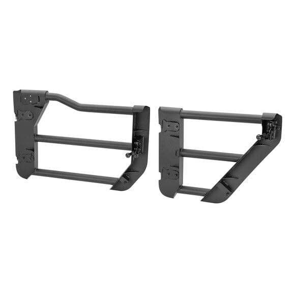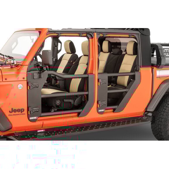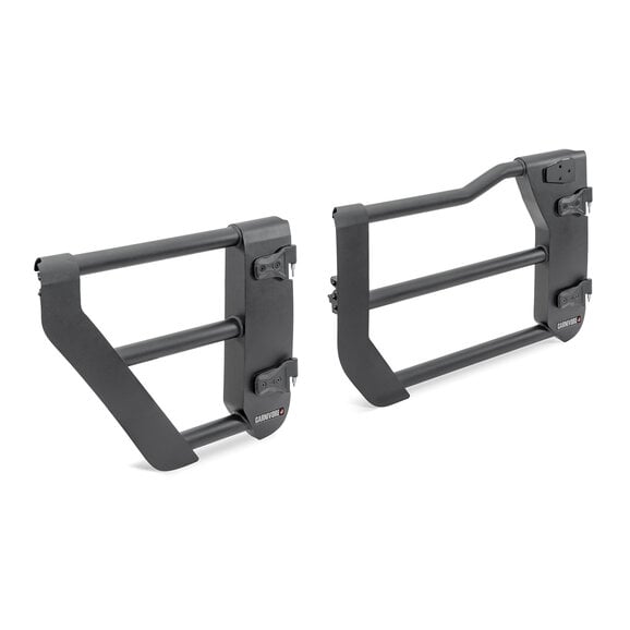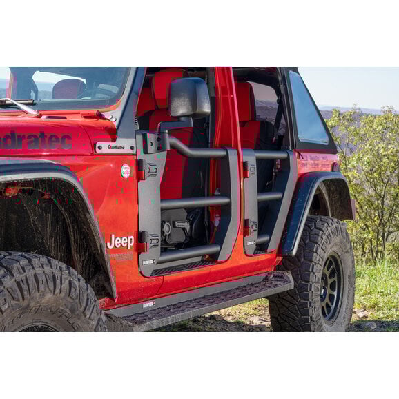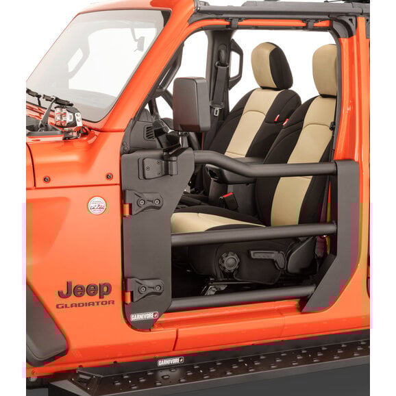 These Carnivore Tube Doors are exclusively engineered to fit 2018-24 Jeep Wrangler and 2020-24 Gladiator JT models, and feature two-stage rotary latches that reduce vibration and rattling. They utilize 2” diameter steel tubes for rugged durability and offer contoured sheet metal construction that neatly follows door openings and body contours. Carnivore's tube doors also include adjustable door check straps and the custom cast metal hinges utilize factory door retention nuts for added security. Additionally, these doors are designed with a textured black powder coating that provides lasting durability, superior corrosion resistance and eye-catching good looks. Kit includes two front and two rear doors, as well as adjustable door check straps. Features a three-year limited warranty. Not compatible with factory mirrors — please see the recommended section for compatible mirrors.