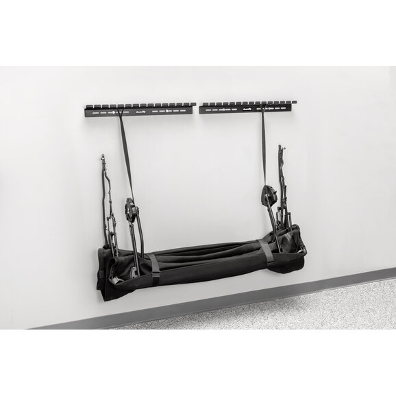 Maximize your garage space and protect your Jeep Wrangler's soft top with this Quadratop Premium Wall Mount Soft Top Storage Hanger System. Designed for all CJ and Wrangler models, this innovative storage solution ensures your soft top stays in pristine condition during off-season months or whenever you decide to go topless. Easy to install and robustly built, this storage hanger system is a must-have for any Jeep enthusiast. Kit includes hanger system and all mounting hardware, and features a one-year warranty.
