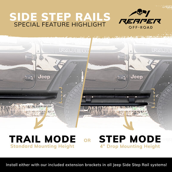 The Reaper Offroad Immortal Side Step Bars add both style & function to your Gladiator JT. These step bars are constructed from durable steel to withstand the rigors of off-road traveling and are powder coated to resist corrosion. While in the trail mode these side bars protect the lower panels of your Jeep and when you need that extra bit of help to get in & out of your Jeep just drop it to step mode to give you easy access.