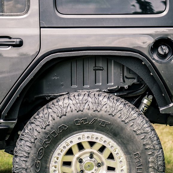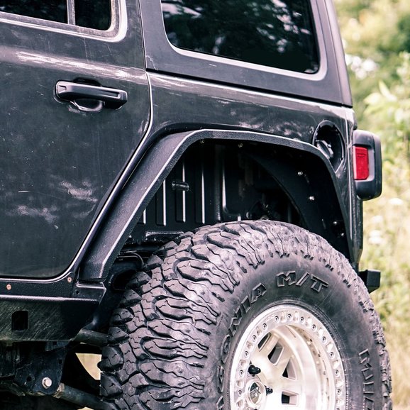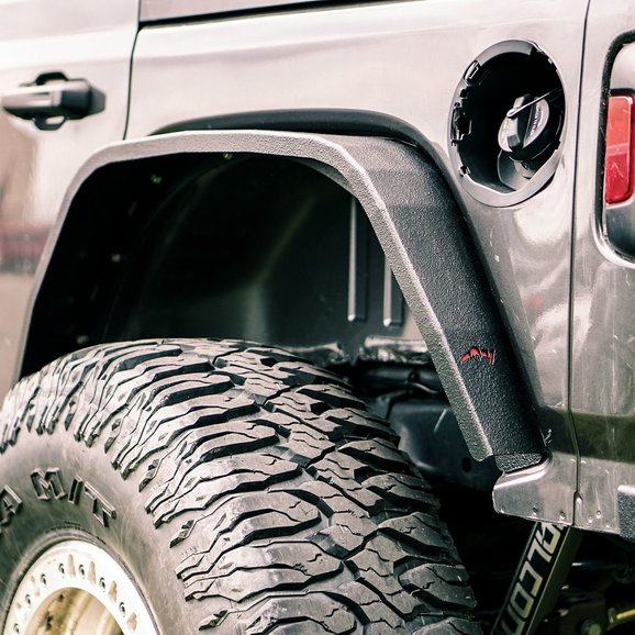 Reaper Off-Road Ripper Rear Fender Flares for the Jeep JL 2-Door and Unlimited JL 4-Door models feature an excellent high clearance design for maximum tire clearance and aggressive styling. The measurement of the flare at its widest point is 3.75". These fender flares are built from corrosive resistant 5052 aluminum and welded in house at Reaper Off-Road by American fabricators. The included backing plates can be painted for a customized look to further enhance the appearance of your Jeep. These fender flares come in a high quality black textured coating that is durable and weather resilient. Some drilling required.