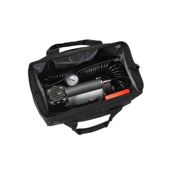 Having the right tools is a necessity when you own a Jeep vehicle, especially if you enjoy hitting the trails. One tool that should be at the top of your list is this 30 Amp Portable Air Compressor from RES-Q®. With a max working pressure of 150 psi, you will have peace of mind having the ability to air up your own tires after an exciting day on the trails. Designed to work on tires up to 37x12.50x17". The 12-Volt Permanent Magnetic Motor with 33% Duty Cycle @ 100 psi allows you to air up longer with a max continuous use at 30 psi of 60 minutes at 73F ambient temperature. Draws 30 amps and has a decibel rating of 69dB. The included 25' coiled hose comes with a built-in pressure gauge and quick-release chuck for ease of use. The tire deflators can be preset to anywhere between 6-32 PSI, making airing down a breeze. An easy-to-transport carrying and storage case, alligator clip power cord, and hose adapters are also included. Works great with Jeep, car, pickup, Bronco, SUV, trailer, camper, motorhome, bicycle, motorcycle, and other tires.