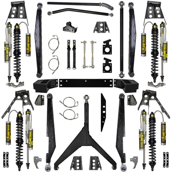 The Rock Krawler development team decided to design an off the shelf system for the JK Wrangler, tough enough to pre-run the toughest Off-Road races or help you build the baddest mall krawler on the planet, a suspension system that performs flawlessly off road without sacrificing on road handling. The Rock Racer system was designed for speed. Both the bypass and coil-over shocks feature a remote reservoirs to minimize fade & maximize shock travel. The coil overs are a true dual rate setup with transition rings for height and cross over adjustment. The 3 tube bypass shocks are externally adjustable with compression, rebound and free bleed lead screw. You can dial in the stance, ride, handling and performance you desire with simple adjustments. The Rock Racer system transforms your JK into an off-road beast. Be sure read the Notes regarding this system to ensure you are ready to meet all the vehicle specific requirements for installation. Typical lift heights are from 4.5" to 5.5".