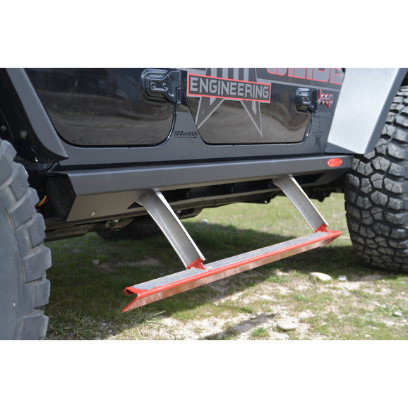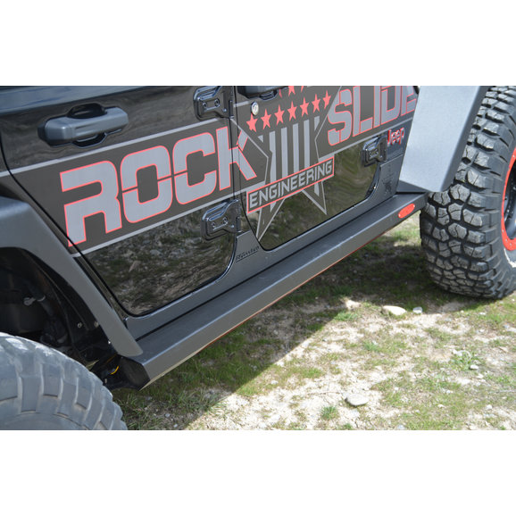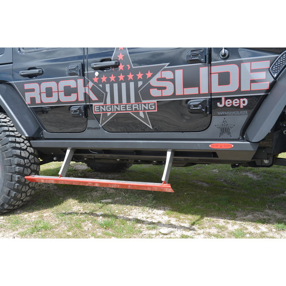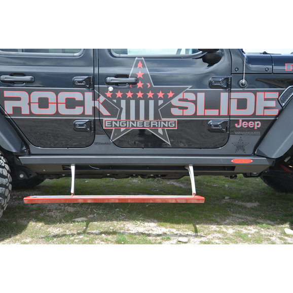 The Gen II Steps Sliders by Rock-Slide Engineering are a dual functioning full rocker guard with a fully functional step that is actuated when the doors open and close. The Integrated rocker guards provide even more protection for the sheet metal on the body of the Wrangler JL 4 Door. These Step Sliders are very strong and are manufactured from laser cut 11 gauge steel and finished in black textured powder coat for years of lasting performance. The Steps automatically deploy when the doors are opened, and extend a full 12" below the Jeep and will be perfect for lifted vehicles. Close the doors, and the steps automatically retract to their original position. A rocker switch with wiring is included if you want to keep the steps in the retracted position, and not deploy. Installation is easy, with no drilling or modifications to the Jeep at all. All necessary mounting hardware and wiring are included for a complete no hassle installation. Sold in Pairs.