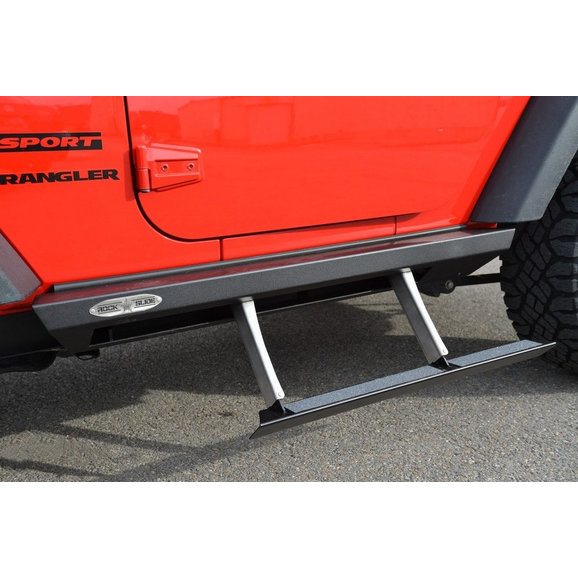 Tackle even the toughest trails with the Rock Slide Engineering Gen III Step Sliders. In addition to being a heavy-duty functional slider, the Gen III Step Sliders have a built-in step that extends when you open Jeep’s doors. RSE designed their Step Sliders to be plug-n-play, and the door sensors attach with magnets. When deployed, the steps hang 12” lower than a Wrangler JK rocker panel. These rugged Step Sliders are constructed from textured black powder-coated laser-cut 11 gauge steel. RSE designs and manufactures their Gen II Step Sliders in the USA!