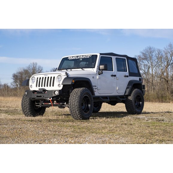 Combination Lift: Rough Country uses a combination of lifted coil springs and 3/4" coil spacers for their 3.25in Suspension and Spacer Lift Kit. This lift will allow you to fit 35x12.50 tires on your four door Jeep Wrangler JK. You will also need between 4.5” and 4.75” of backspacing, so if you are using factory wheels, then you will need 1.5” wheel spacers.