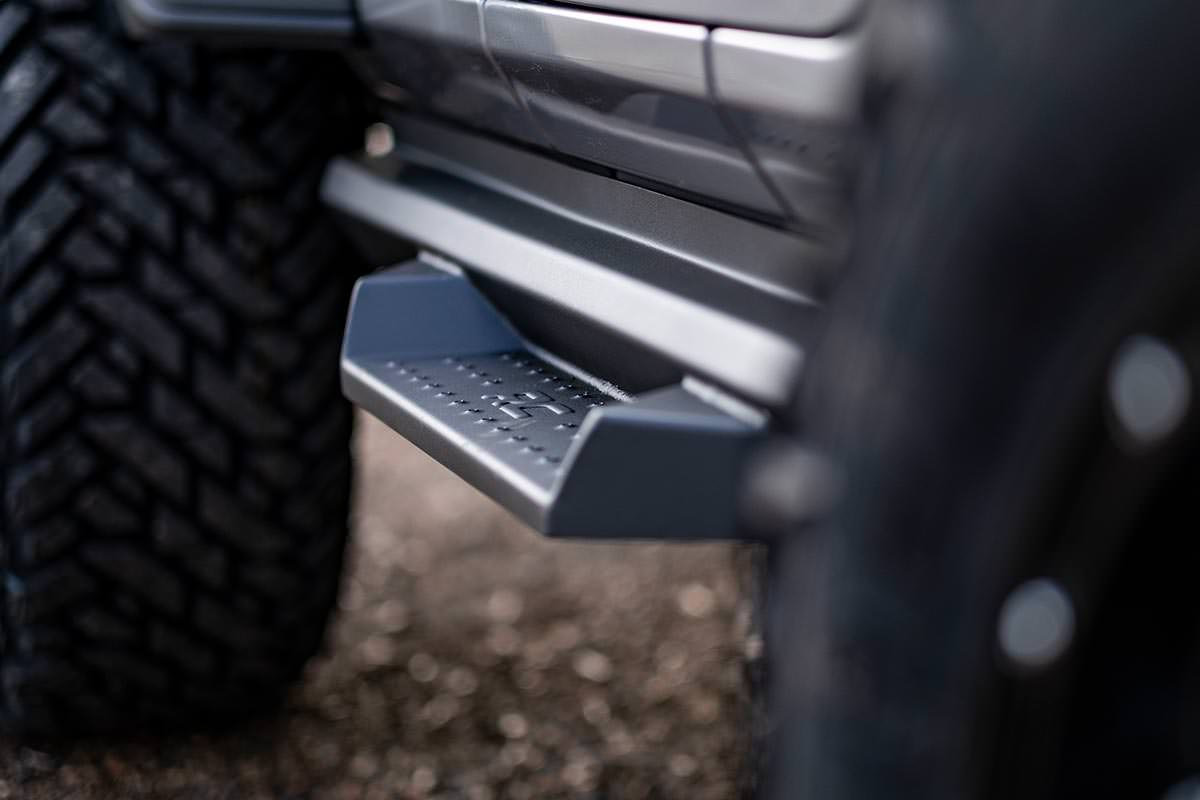 Built-In Step: For ease of entry, there is a convenient step with a stamped tread and “RC” logo under each door. This is especially helpful for lifted Jeeps. The mounting plates are adjustable by 1/2", so you can make sure your steps are exactly where you need them.