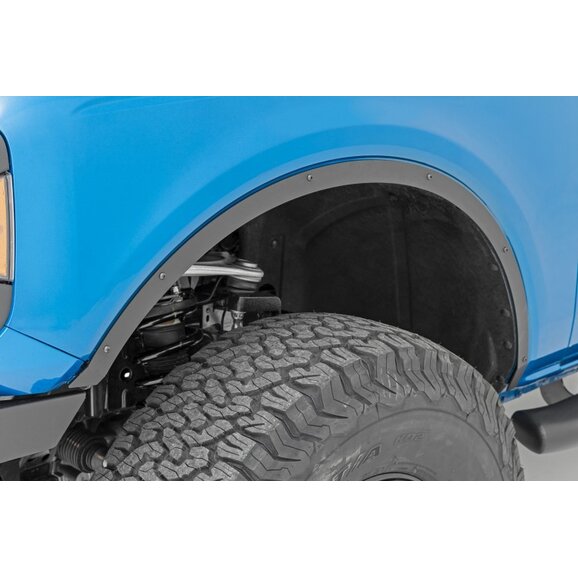 The Rough Country Fender Flare Delete Kit offers a stylish way to achieve maximum tire clearance in your Ford Bronco. The precision laser-cut design ensures perfect fitment and a clean, streamlined look, while the 1/8” black powder coated steel is made to endure and resist corrosion. Enjoy the maximum range of articulation and flexing as well as an improved line of sight to take on the toughest trails, and easily switch back to OEM flares if desired. Backed by Rough Country’s Limited Lifetime Warranty, you can purchase this fender flare delete kit with peace of mind and hit the trails with confidence.