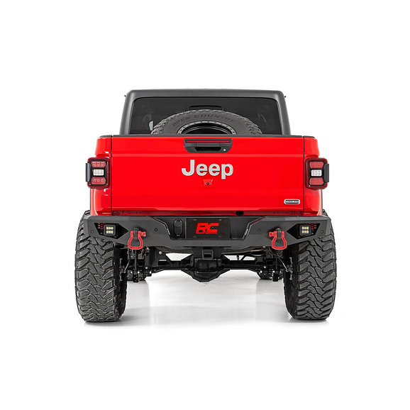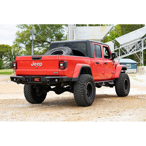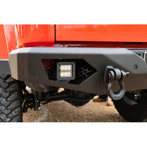 Protect the overhang of your Jeep Gladiator JT's bed with this Heavy-Duty Rear LED Bumper from Rough Country. Manufactured from heavy-duty steel and finished with a textured black, corrosion-resistant black powder coat for long life. Provides more clearance for larger tires and allows more off-road flex. The integrated steps offer ease of access to the bed. Includes a pair of 2" LED cube lights (2880 Lumens - 36 watts) that perfectly compliment the bumper while providing extra rear-facing light. Works great with the factory hitch. Backup sensor relocation brackets and 2 d-rings are also included.