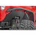 Complete the look of your Jeep Wrangler JL with the Rough Country Front & Rear Inner Fender Liners. These black powder-coated steel inner fender flares provide protection and a clean appearance. The front inner fender liners include removable panels that feature laser cut “RD” logos. This will allow you to run reservoir shocks on your Jeep. For a color contrast, Rough Country also includes paintable backing plates that fit behind the logo. The rear inner fender liners have cutout “Rough Country” logos that line up with the body tub to show the factory paint. Rough Country designed their inner fender liners for use with their Tubular Fender Flares and Fender Delete kits, but they are also compatible with most aftermarket fender flares.