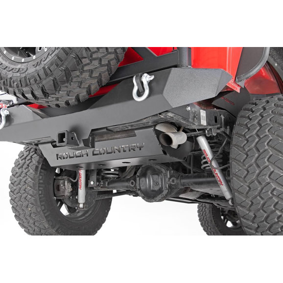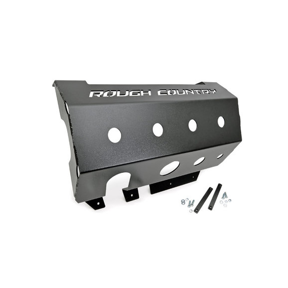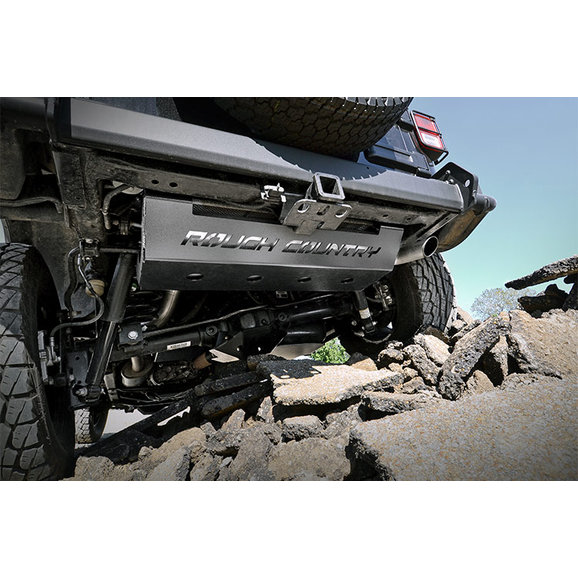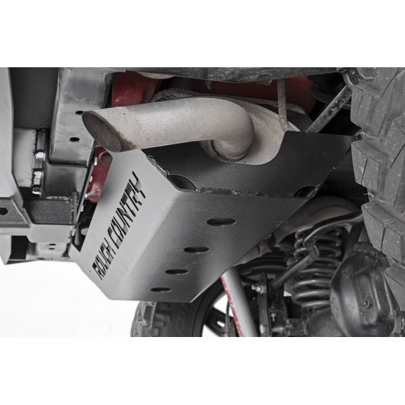 The Jeep Wrangler JK muffler is vulnerable to rocks and other trail hazards. Crushing exhaust components is a common issue for off-road enthusiasts. The Rough Country Muffler Skid Plate will give you peace of mind with added protection. This 100% bolt-on skid plate is made from heavy-duty 3/16” steel plate. The laser-cut “Rough Country” logo and vent holes allow for proper heat dissipation while retaining strength and rigidity.