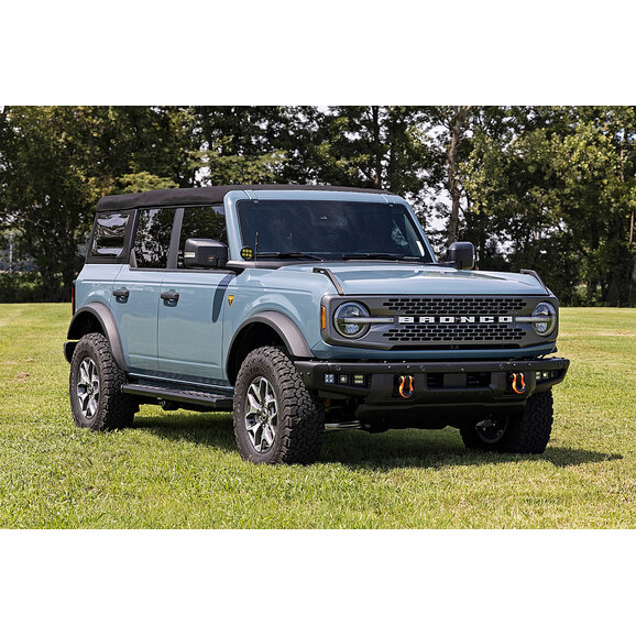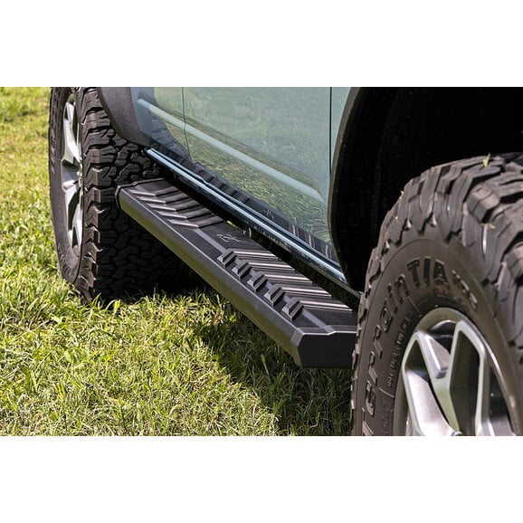 Gain easier access to your 2021-23 Ford Bronco 4-Door cab with Rough Country's BA2 Running Board Side Steps. These superior quality boards feature a comfortable, five-inch wide stepping area with an integrated insert design that ensures foot placement when climbing in and out of your vehicle. Each running board offers a durable powder-coated finish and nonslip surface that can support up to 500 lbs. Installation requires no cutting or drilling and includes all mounting hardware. Features five-year warranty.