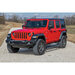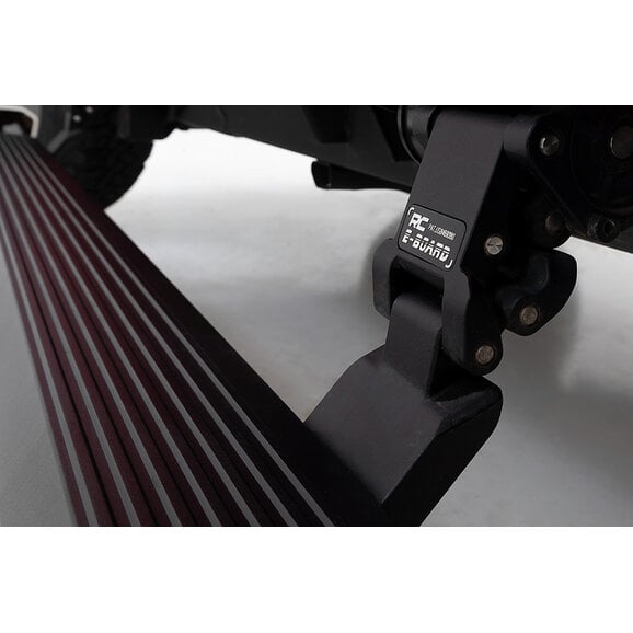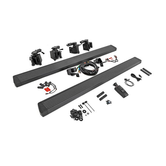 The Rough Country Power Running Boards for the Jeep Wrangler JL Unlimited 4-Door make getting in and out of your lifted or stock-height Wrangler a breeze. They combine durability, strength, and style into a system made from lightweight yet durable aluminum and can support up to 300 lbs per step. These retractable E-Boards tuck tight for a clean look when not in use and automatically extend when the door is opened. With a six-inch platform with an anti-slip surface that provides a secure stepping area, getting in and out of your ride has never been easier. Rough Country's Power Running Boards also include LED lights that provide illumination when deployed and shut off when steps are closed, providing a sleek, aerodynamic look. Equipped with dual motor technology, these steps can handle anything Mother Nature throws their way. They feature an automatic 'SAFE-STOP' mechanism that engages if a blockage is detected and include an interior bypass switch for manual override. So, whether you're heading out on a weekend errand or loading up for a camping trip, our electric steps offer reliable protection for all your adventures.