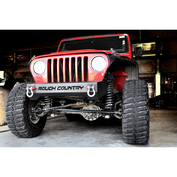 Give your Jeep Wrangler an aggressive, high-clearance look with the Rough Country Stubby Front Bumper. This 100% bolt on bumper is made from high tensile steel and finished in a durable black carbon powder coat. The front face of the bumper features an attractive laser cut “Rough Country” logo. This bumper is compatible with both YJ and TJ Wranglers, and weights less than 40lbs, so it will not weigh down the front of your Jeep.