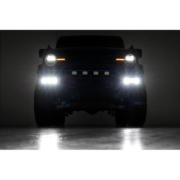 The IP67 waterproof rating ensures that these lights can withstand the harshest conditions you can throw at them, from mud to dirt or any off-road trail! The included LED lights produce an incredible 14,000 lumens, making it easy to see in even the darkest conditions. Additionally, the Moisture Breather technology reduces moisture build-up behind the lens, making sure your lights always perform at their best. So, whether you're driving through thick fog or inching your way down a dark trail, you can rest assured that you'll have the visibility you need.This 100% bolt-on kit discreetly mounts into your OEM bumper, right in the factory fog light location. The brackets are hidden from view for a clean and flush factory-looking install. But don't let the sleek design fool you - this thing is built tough! Rough Country's kit also includes a premium, flat-wound wiring harness with an on/off switch. No cutting or drilling is required, so you can get this installed and hit the trail in no time flat.