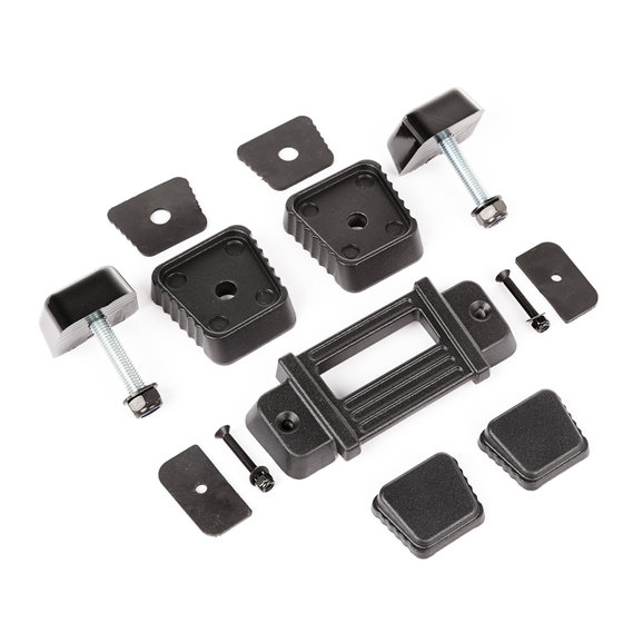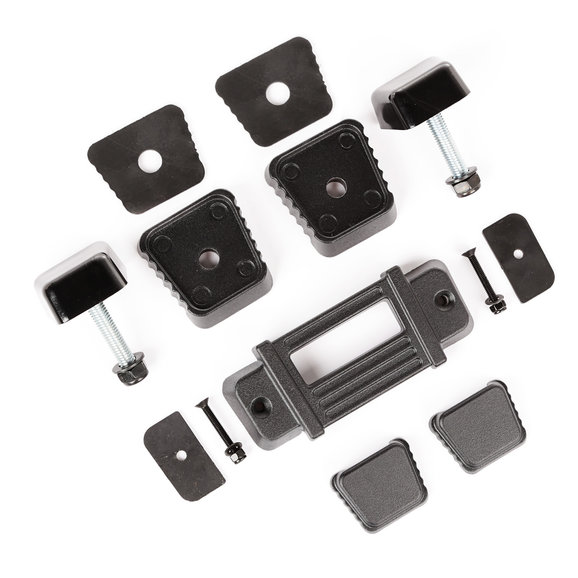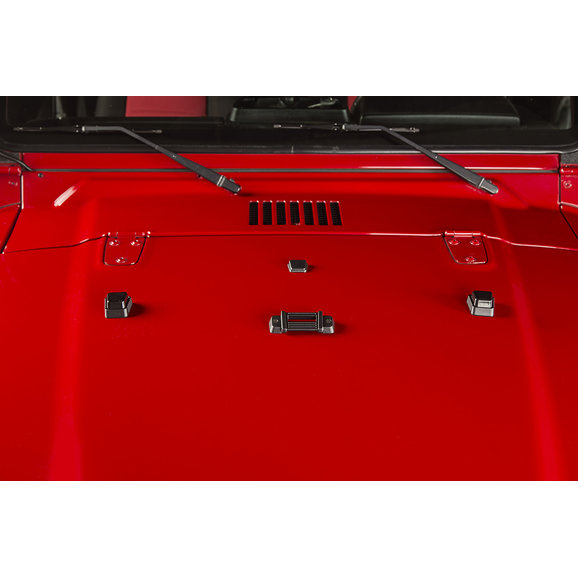 The Elite Hood Dressup Kit from Rugged Ridge adds a stylish custom touch to your Jeep. Constructed of high-quality 6061 T6 cast aluminum with a unique billet design and a premium black textured powder coat for a long-lasting durable finish. Each Hood Dressup Kit consists of a buckle-style footman loop, a pair of polyurethane bumpers with aluminum bases , two washer nozzle covers, gaskets and hardware to complete the package. The Rugged Ridge Elite Hood Dressup Kit is designed to be the perfect accent to Rugged Ridge Aluminum Hood Catches, as well. Installation instructions included.