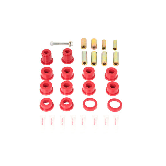Replace your rubber OE front control arm bushings with these red polyurethane ones from Rugged Ridge. There has been an ongoing debate about rubber vs. polyurethane as to what is better, It truly depends on how you are using your Jeep. In most cases polyurethane outperforms its rubber counterparts in replacement of bushings and mounts. The products will last longer standing up to road debris, chemicals, oils, compression, and load. They will perform better by removing additional sloppiness in suspension performance due to worn, damaged, or missing bushings. It is however, a little stiffer than rubber.