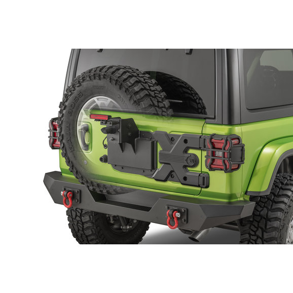 39" Spare Tire Capability: Making this system extremely versatile with strength for maximum load capacity. Engineered from a die-cast aluminum casting with forged steel hinge brackets and hardened steel pins. Handling the abuse of the trails with ease and confidence. Wheel on my friend.