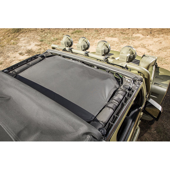 Rugged Ridge Total Eclipse Shade revolutionary design offers superior protection from the intensity of the sun’s rays without the need for a separate windshield header. The Total Eclipse Shade 1-piece design utilizes the same attaching method as our Eclipse Sunshade, securing to the windshield frame and sport bar with integrated bungee straps, so there is no cumbersome buckles or straps to lose, but provides a greater level of sun protection with durable Black Diamond soft top fabric . Installs in minutes and can be left in place with the top on or off. Includes a handy storage bag.