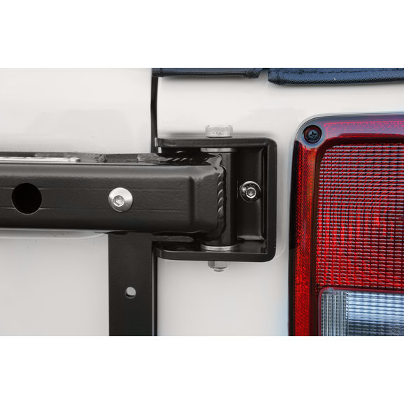 Rusty's Hinge Spare Tire Carrier for Jeep Wrangler JK's is a heavy-duty Tire carrier that mounts to the body with included stainless steel mounting bolts. The 1/4-inch steel fabricated tire mount has the option for the factory 5 on 5 bolt pattern as well as the popular axle swap bolt patterns of 5 on 5.5 and 8 on 6.5. The tire carrier allows the installation of up to a 40-inch tall tire while retaining an easily accessible one-handed operation. Because the position of the tire is adjustable, you can be confident that the spare tire will clear most aftermarket rear bumpers. The Tire Carrier is black powder coated for protection and weather resistance.