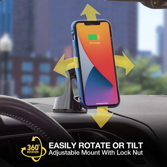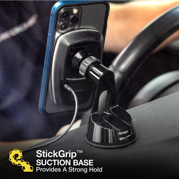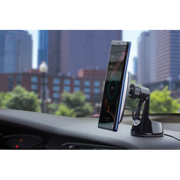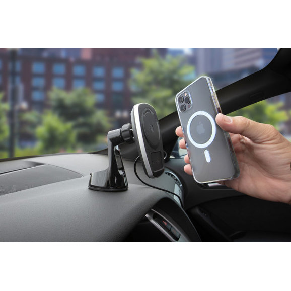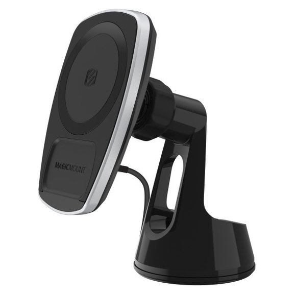 Easily mount your smartphone or GPS to your vehicle's dash with the MagicMount Pro Charge 4 wireless charging device Mount from Scosche. This mount attaches directly to your windshield dash or any flat surface with the included automotive-grade suction cup base. Wirelessly charge any Qi-certified device without the need for any cables. Attach the included MagicPlate to Qi-enabled phones. You will feel the MagicPlate snap into place on the charging head and your phone will start charging. The 360 Degree rotating and pivoting base locks for secure positioning and allows optimal viewing from almost any angle. The extremely powerful Rare-Earth neodymium magnets provide a secure grip on your devices and are 100% mobile device safe.