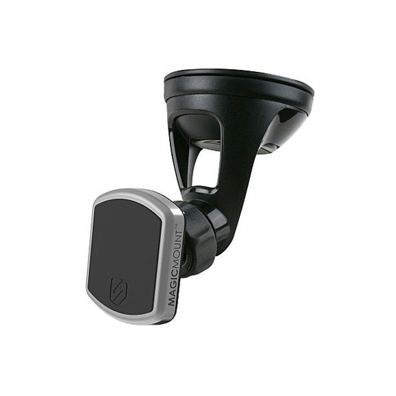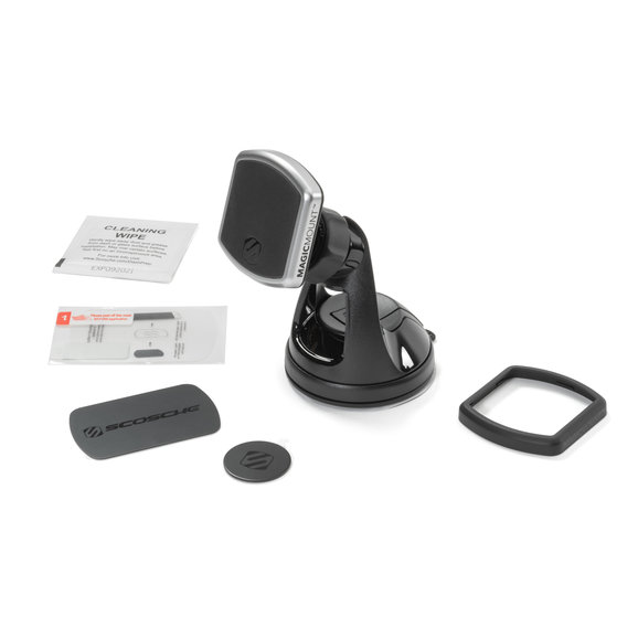 Easily mount your smartphone or GPS to your windshield or dash with the MagicMount Pro Window/Dash mount from Scosche. This versatile mount uses StickGrip suction that adheres to multiple locations in your vehicle, at home or in the office. The MagicMount base features extremely strong N50 neodymium magnets that keep your device secure and at the perfect viewing position at all times. This kit includes 2 different size magnets that attach to the device and eliminates the need for anything to tighten around the device. Just hover the magnets over the base, and it will snap into place securely and you are ready to go! The integrated cable clips are made to attach any cords to the rear of the base, keeping them neatly out of sight. All MagicMount magnets are completely safe for all smartphones and devices. The low profile dash mount features an automotive-grade peel and stick adhesive that will last for years. Two interchangeable trim rings are included to add a custom look to your choosing.