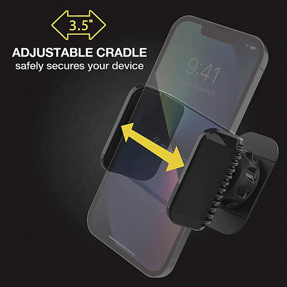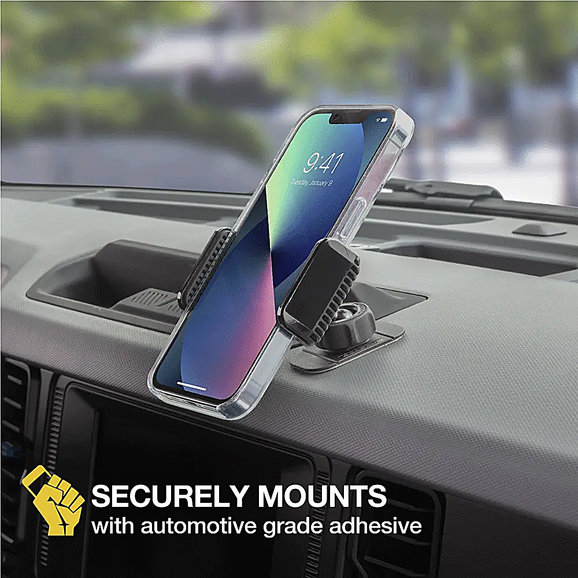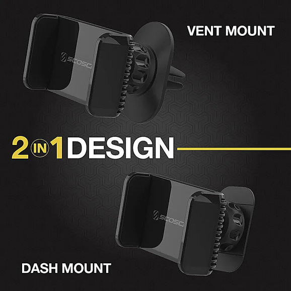 The Scosche Universal 2-In-1 Vent & Dash Phone Mount Kit for Vent or Dash is a great way to have your iPhone visible and hands-free. The 2-In-1 car phone mount kit can be used on your vehicle’s vent or on a firm & flat dashboard surface area to mount your compatible mobile phone device. The vent mounts are great for moving from vehicle to vehicle. The mount allows air to flow from your vehicle's vent without disrupting. The Vent and Dash bases each have a ball joint and lock-nut, allowing you to remove and switch base options whenever you choose. The dash mount secures a mobile phone device to your vehicle's dash on a firm & flat surface area using the included automotive-grade adhesive strip. The 360° Adjustable head allows you to view your phone in portrait or landscape.