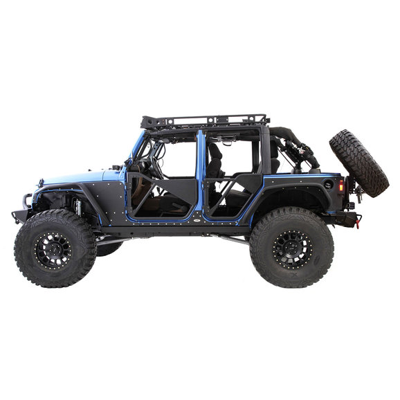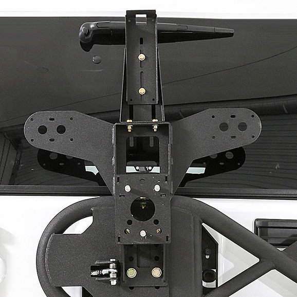 The XRC Slant Tire Carrier Conversion Kit is designed to convert your Gen2 tire carrier or Pivot HD into an aggressive pre-runner looking tire carrier. Works perfectly with Bowless, Slant back soft or hardtops and is made from 3/16 inch cold rolled steel with a two stage textured matte black powder coat finish. The Slant Tire Carrier will work with up to a 37" tire and includes a Jack and Roto Pax gas/water can mount.