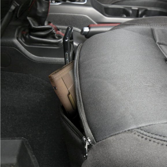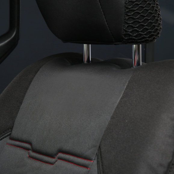 Design: The front seat covers have side air bag provisions and a rear net pouch on back of front headrest and seats.The rear seat cover has access to child seat anchors. The covers have Double stitched thread lines to match O.E. styling. These covers are equipped with removable rear panels for vehicles equipped with or without factory MOLLE panel. The Center section is padded and pleated for comfort and durability. A front zipper pocket is incorporated into the front of the seating area for extra storage.