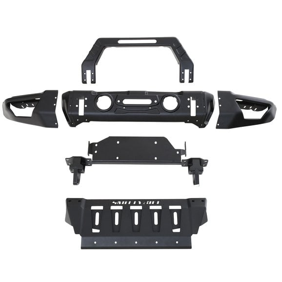 Features: Where to start with this great bumper. First you have the optional modular wings that have light provisions giving you a full width bumper or you can remove them for those tight trail runs. No need to worry about your factory fog lights as this bumper has OE fog light provision. If you are ever stuck, or helping someone who is, you can use the integrated recovery points or you can mount a winch on it. The overrider gives you the ability to add more lighting on your rig with a 13" light bar provision.