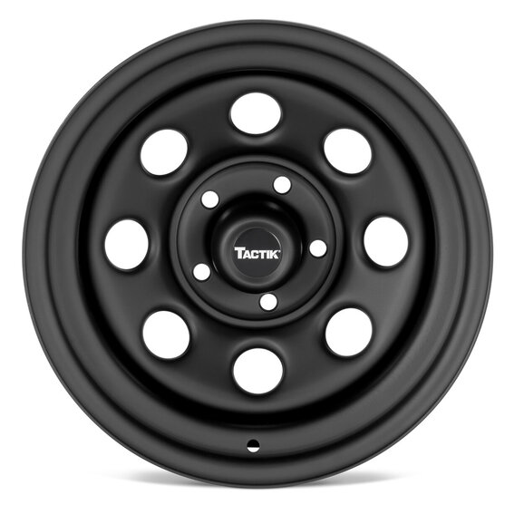 Tough, Durable, Great-Looking and at an Amazing Price! TACTIK steel wheels feature classic styling and are SAE J 2530 tested for strength and durability to endure daily use and off road abuse. TACTIK wheels are E-coated and powder coated with a durable satin black finish on both sides for superior corrosion resistance and lasting good looks. Wheels include a black TACTIK logo black center cap.