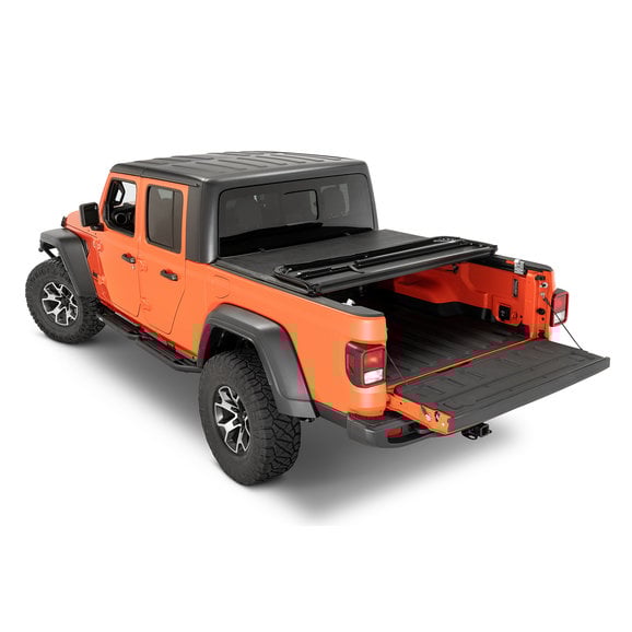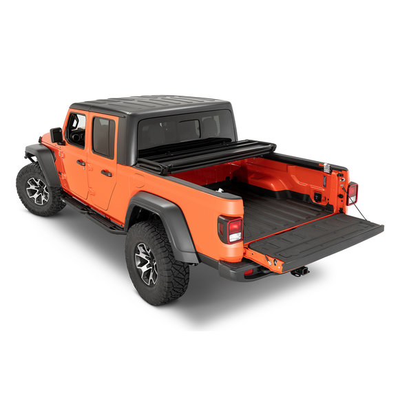The TACTIK EZ-Hard Panel Tri-Fold Tonneau Cover with Outer Vinyl Layer is exclusively designed for Jeep Gladiator JT to provide a protective, sleek, and stylish look. With its durable 24oz marine grade vinyl covering, the hard panels are neatly protected and engineered to secure all bed cargo from moisture, dirt, and just about any other elements your Gladiator will face during travel. Mounts securely to the truck bed rail using a unique clamping system, theft protection rail, and latch design. The cover will lock automatically when the last fold closes and you lock the tailgate. Aircraft-grade aluminum cross bars provide stability and a snug wrinkle-free fitment. Weathertight sealing helps ensure no moisture can enter the bed once the tonneau is deployed. The solid core, hard panels are rated up to 500 lbs of evenly distributed weight and sit under vinyl material protection. Tonneau does require some assembly before installation, but no drilling or welding is required and can be mounted with simple hand tools. Features a five-year warranty.