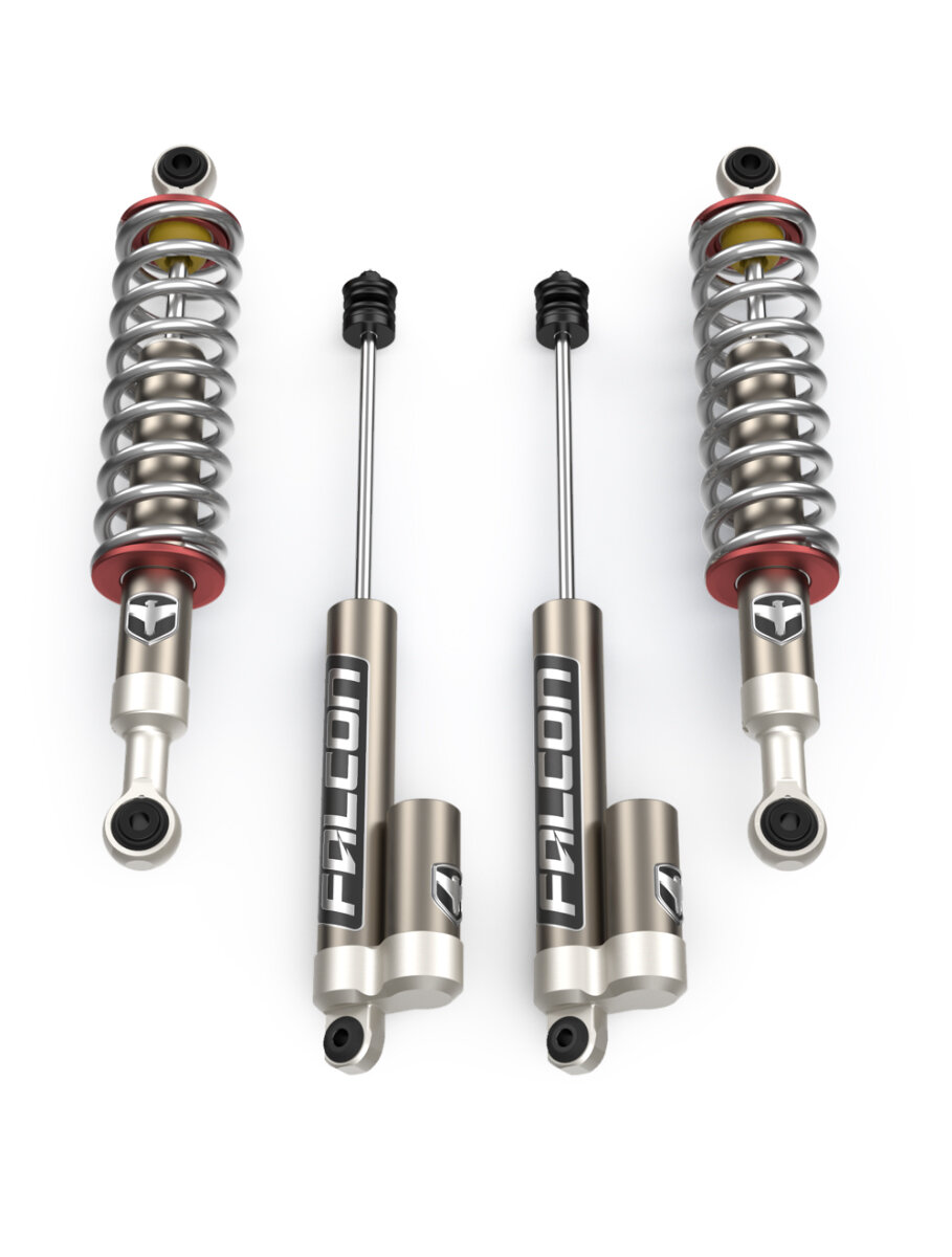 Falcon 1.2 monotube shocks are engineered to provide improved suspension control and stable damping performance compared to factory shocks. The system helps manage suspension movement during acceleration, braking, and cornering while maintaining predictable ride characteristics across both highway and light off-road conditions. Designed specifically for Tacoma suspension geometry, the system installs as a complete leveling upgrade that helps improve vehicle stance, ride control, and overall driving confidence.