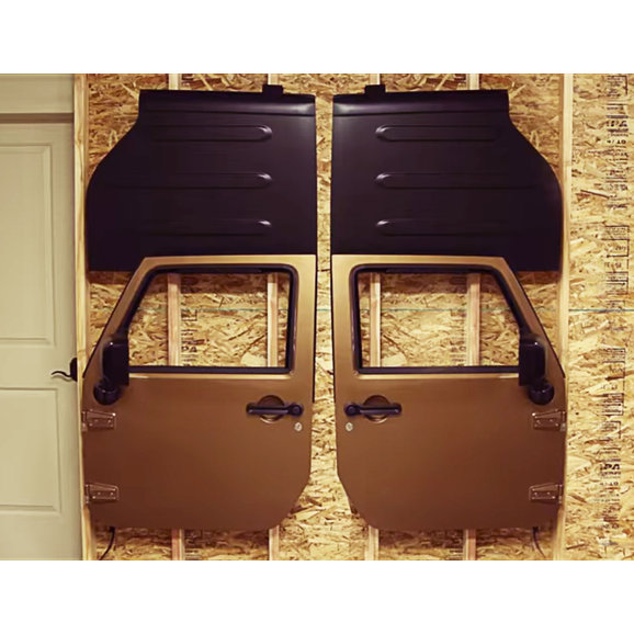 Safely hang your JK Freedom Top and full hard door with this combination kit. The Freedom Top bracket safely stores your Freedom panels when not in use. The bottom bracket also acts as a full door hanger. The bracket fits into the window track and eliminates all pressure off of the window seals and gaskets. Fits 16" or 24" on center stud frame construction garage walls. This kit will hang two Freedom Top panels and two full hard doors.